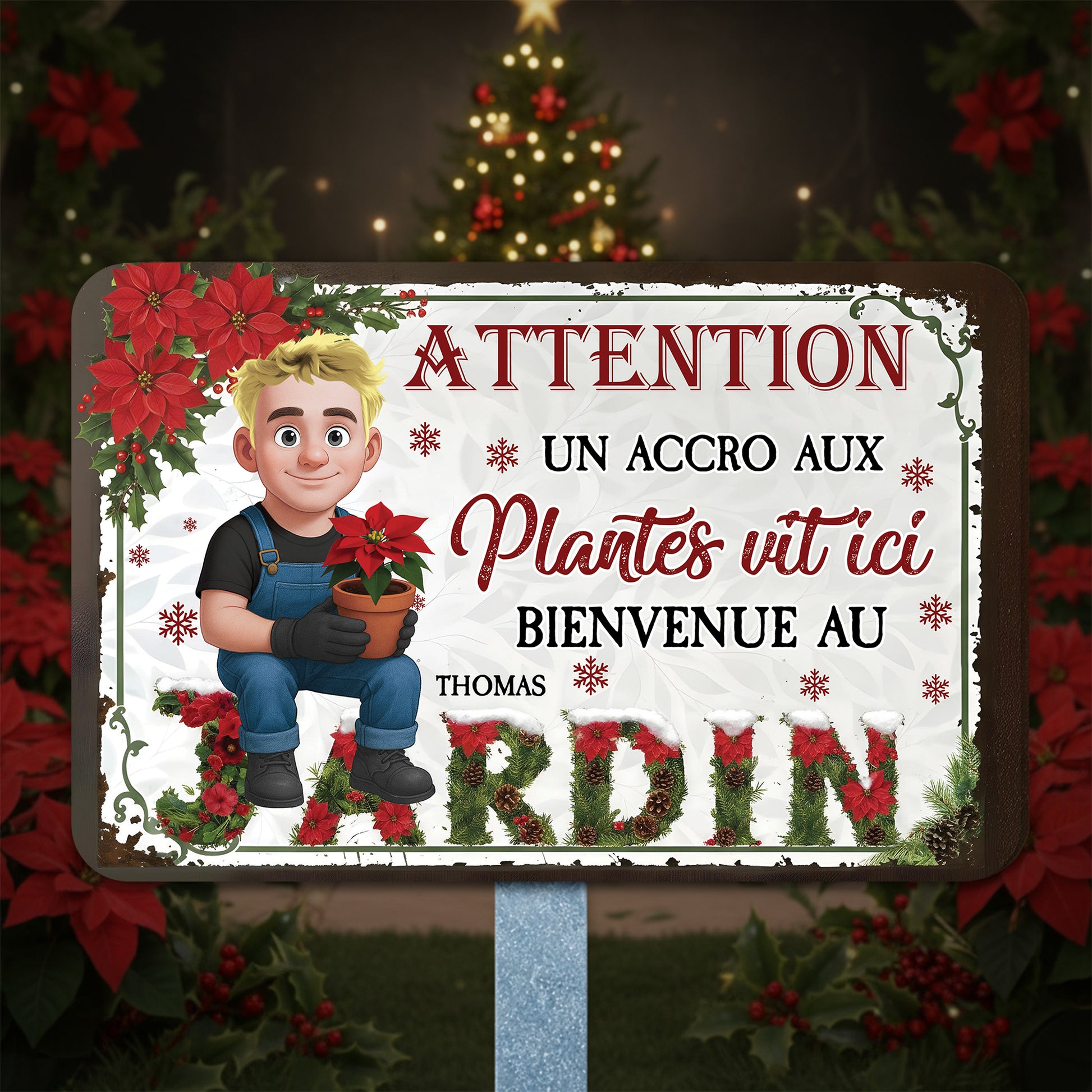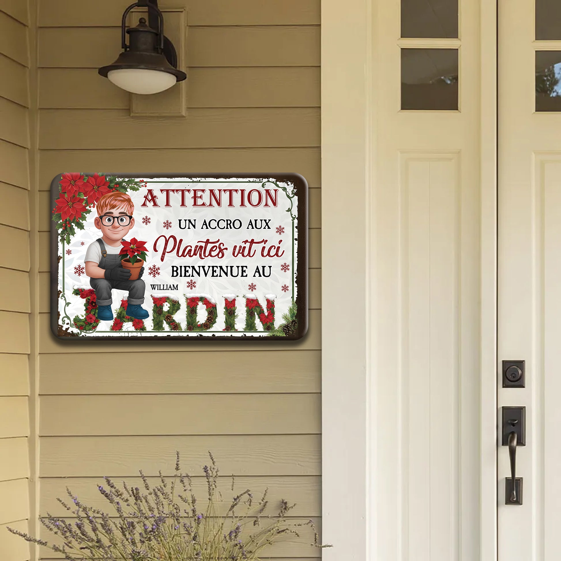 Attention ! Un Accro Aux Plantes Vit ici Bienvenue Au Jardin Noël – Plaque En Métal Personnalisée