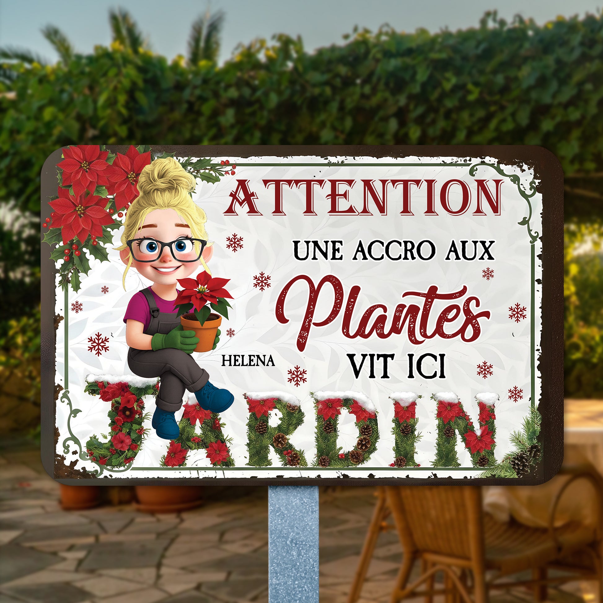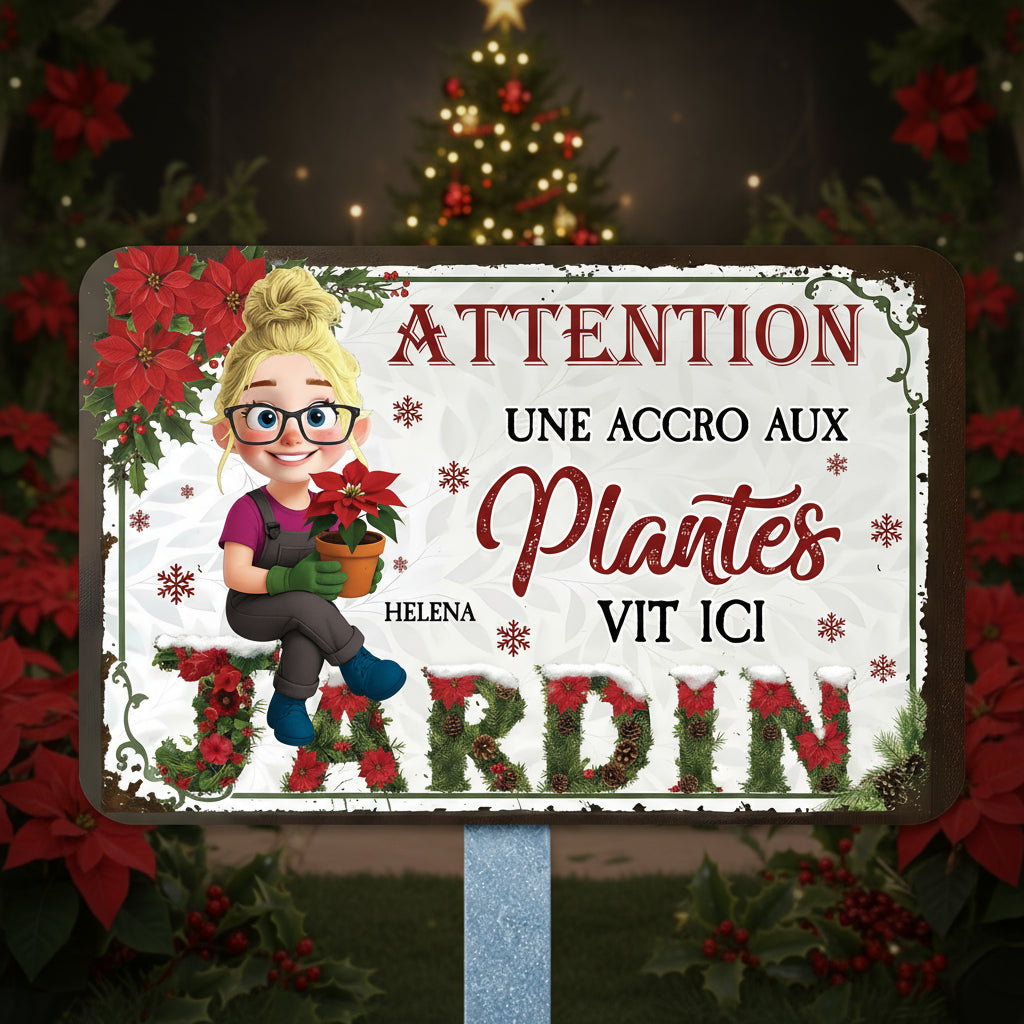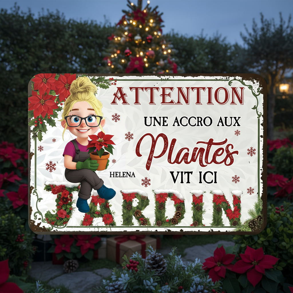 Attention ! Une Accro Aux Plantes Vit ici Bienvenue Au Jardin Noël – Plaque En Métal Personnalisée