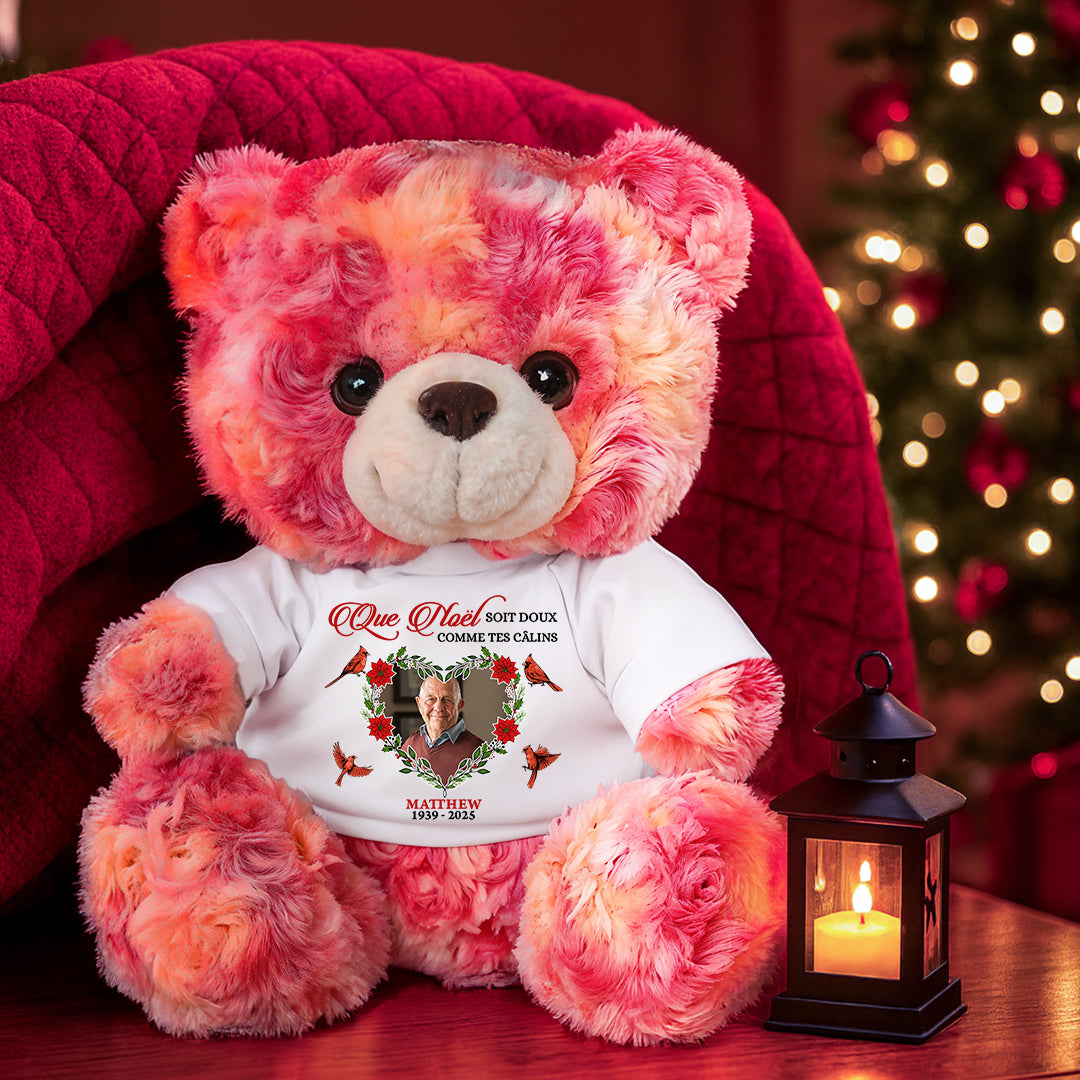 Cet ourson souvenir plein d'émotion, vêtu d'un t-shirt en coton personnalisé avec une photo, symbolise un amour éternel. Doux et câlin, il réconforte petits et grands en devenant un précieux souvenir qui garde tendrement vivants les plus beaux souvenirs pour toujours.