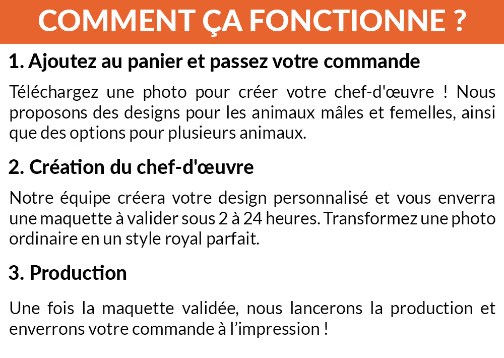 ❤️ Création du chef-d'œuvre Notre équipe créera votre design personnalisé et vous enverra une preuve à valider sous 2 à 24 heures. Transformez une photo ordinaire en un style royal parfait.