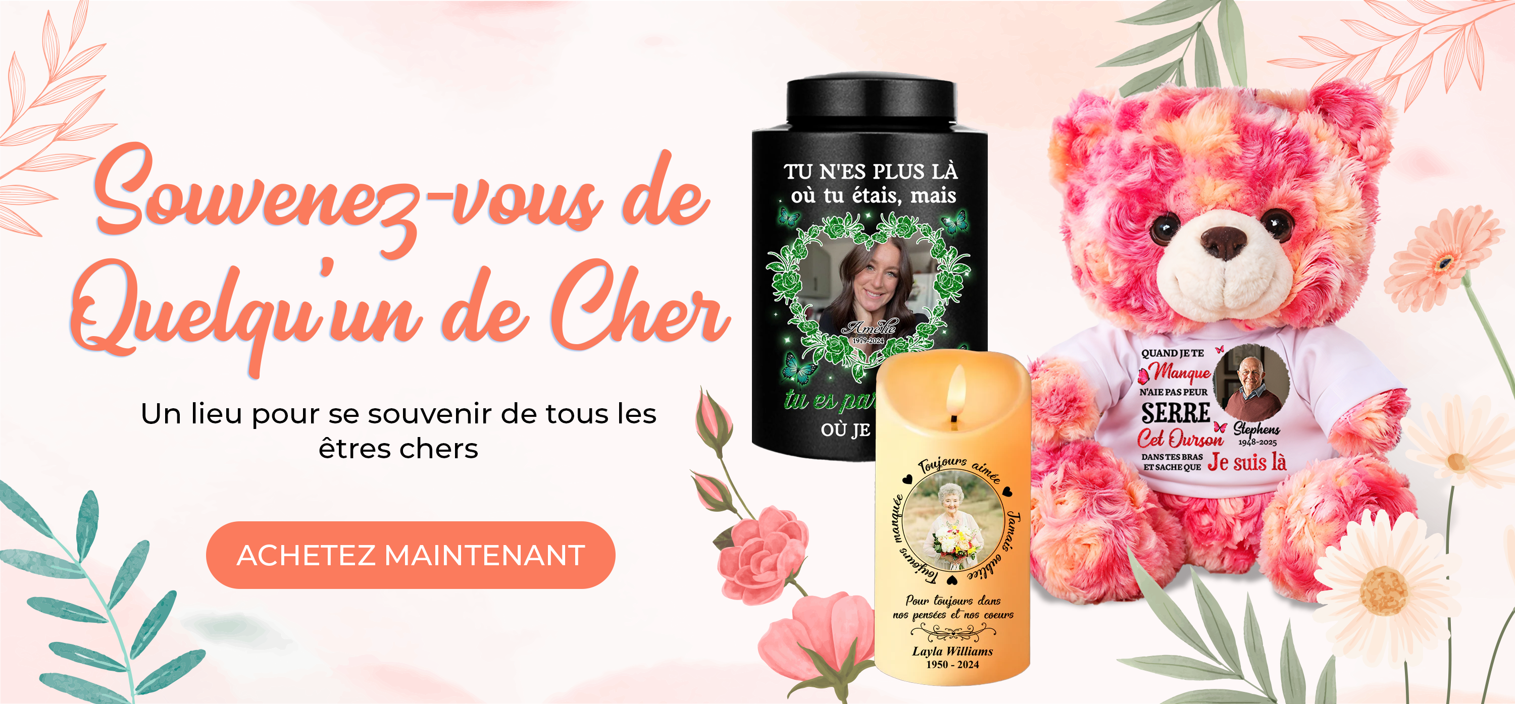 Bien que tu sois parti(e), ta lumière brille à jamais dans mon cœur. Nos souvenirs personnalisés “Souvenirs du Ciel” sont créés pour garder cette lumière près de vous — une façon tendre d’honorer ceux qu’on aime. 🕊️